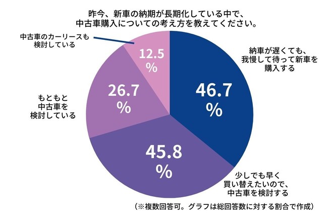 新車の納期が長期化している中でも「納車が遅くても、我慢して待って新車を購入する」という方が全体の46.7%も占めました。一方、「少しでも早く買い替えたいので、中古車を検討する」は僅差で45.8%でした。この二つの意見が真っ二つに分かれたように、「短納期で中古車を購入するか」それとも「長期間待って新車を手に入れるか」を悩んでいることがうかがえます。