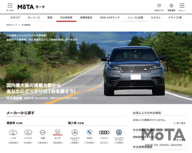 現在、40万台を超える中古車が掲載されている「MOTA中古車検索」。「メーカー」「ボディタイプ」「エンジンタイプ」「駆動方式」「価格帯」などから、あなたにぴったりの1台を探せます。