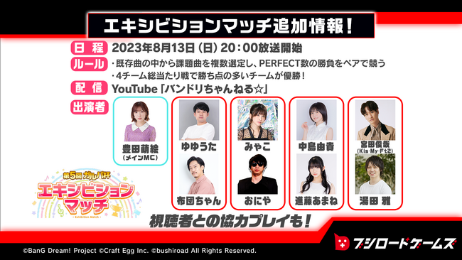 2023年8月13日(日)20時より、第5回ガルパ杯の開催を記念し「第5回ガルパ杯エキシビションマッチ」を開催することが決定いたしました。2人1組のペアとなって既存曲の中から課題曲を複数選び、PERFECTの数で競います。4チーム総当たり戦を行い、勝ち点の多いチームが優勝となります。