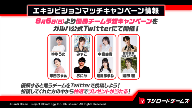 2023年8月6日(日)より、予想に参加してくれた方の中から、抽選でプレゼントが当たる「優勝チーム予想キャンペーン」をガルパ公式Twitter(@bang_dream_gbp)にて開催いたします。キャンペーンの詳細は開催時に発表いたしますので、ぜひご参加ください。