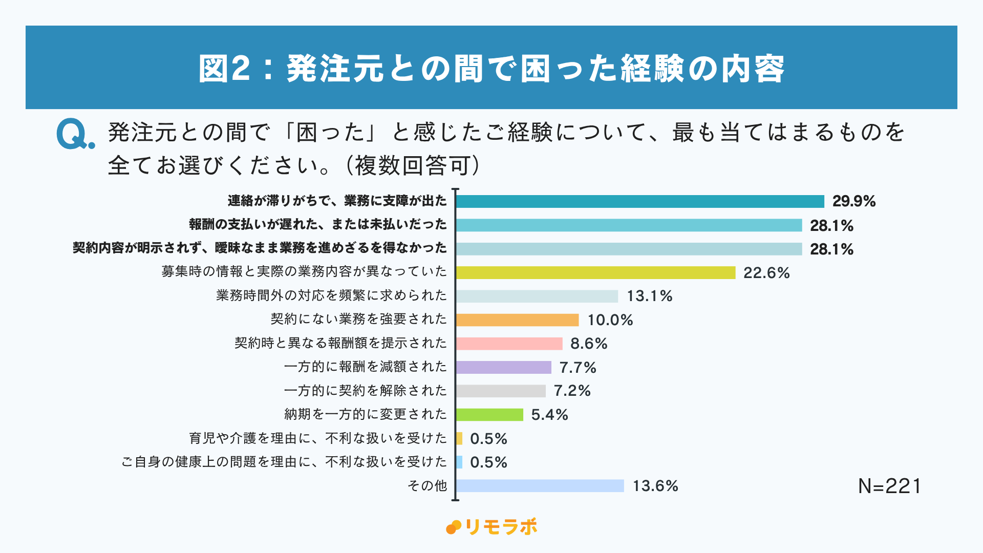また、困った経験が「ある」と回答した方にそのトラブルの内容も尋ねたところ、最も多かったのは、「連絡が滞りがちで、業務に支障が出た」で29.9%でした。次いで、「報酬の支払いが遅れた、または未払いだった」(28.1%)と、新法が明示を義務付ける「契約内容が明示されず、曖昧なまま業務を進めざるを得なかった」(28.1%)が同率で続いており、実務上のコミュニケーションと法的な取引適正化の両面で課題が生じていることが浮き彫りとなりました。(図2)