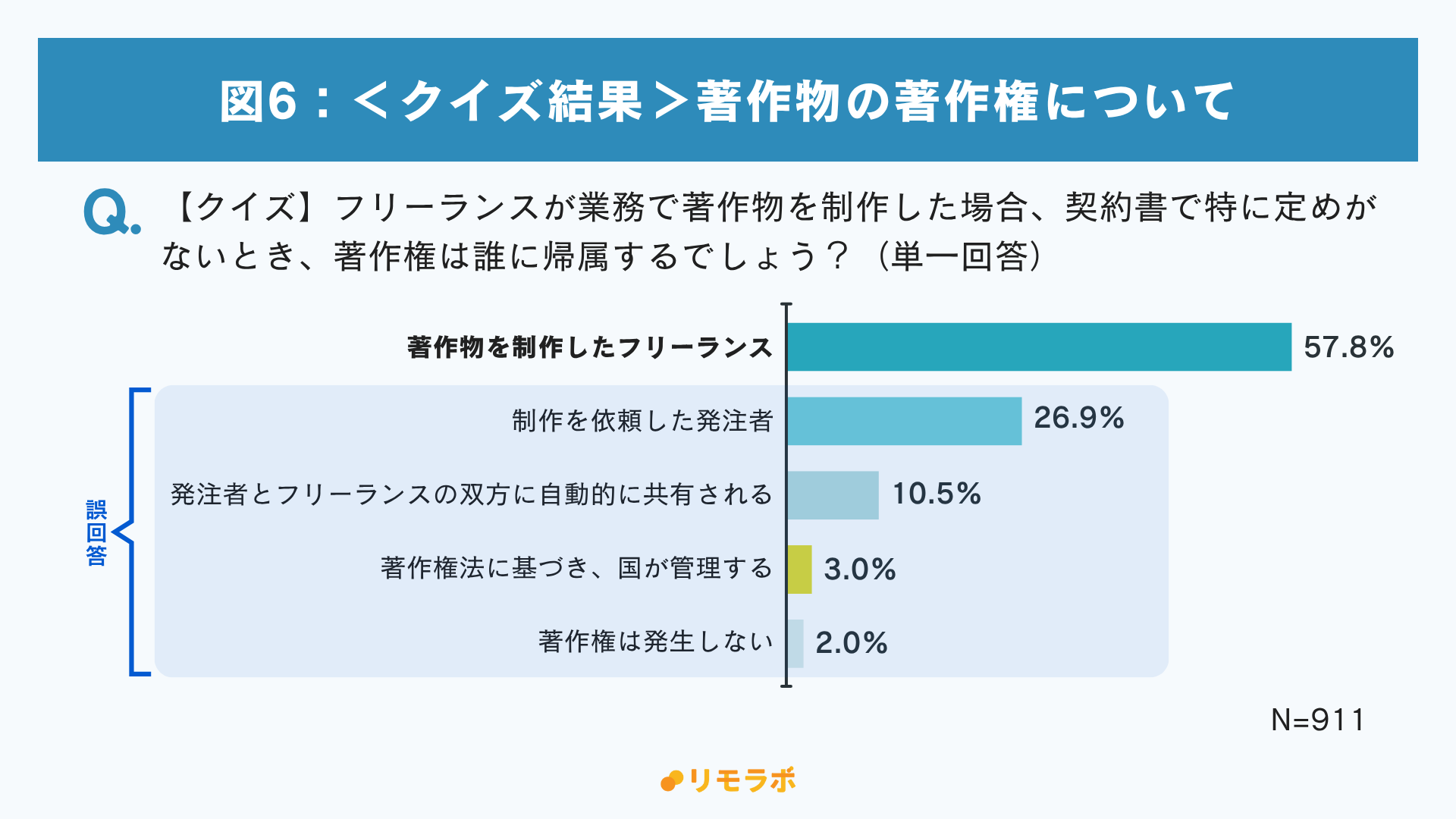 本クイズに関しては、誤答者が約半数(43.4%)に上りました。特に約4人に1人にあたる26.9%が「制作を依頼した発注者に帰属する」と誤認しています。(図6)フリーランスは自らの知的財産(成果物)の権利者であるという基本ルールが浸透しておらず、自身の知的財産権をきっちりと守る意識を高めていくべきといえるでしょう。
