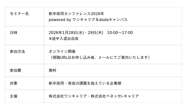 人材サービス事業を展開する株式会社グロップ(本社:岡山県岡山市、代表取締役社長:原田 竜一郎)は、2026年1月28日(水)・29日(木)に開催される企業人事向けオンラインカンファレンス 「新卒採用カンファレンス2026冬 powered by ワンキャリア&dodaキャンパス」 に登壇いたします。本カンファレンスは、採用・人事担当者を対象に最新の学生インサイトや実践施策を共有するオンラインイベントです。