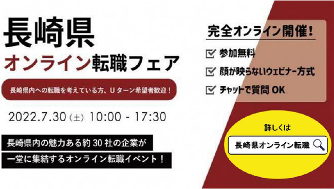 長崎県内の魅力ある企業 約30社が一堂に参加 「令和4年度 第1回 長崎県オンライン転職フェア」開催 【日 時】2022(令和4)年7月30日(土)10時〜17時30分