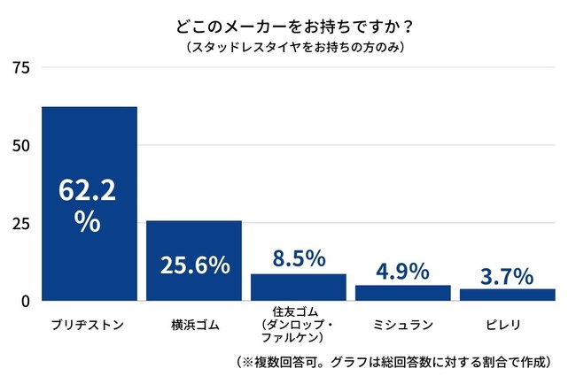 1位「ブリヂストン」(62.2%)、2位「横浜ゴム」(25.6%)、3位「住友ゴム(ダンロップ・ファルケン)(8.5%)と、国内メーカーがトップ3を独占しました。海外勢では4位、5位に「ミシュラン」(4.9%)と「ピレリ」(3.7%)と続きます。