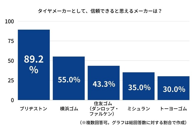 「ブリヂストン」が全体の89.2%と高い支持を獲得し、堂々の1位でした。続く2位は「横浜ゴム」(55.0%)、3位「住友ゴム(ダンロップ・ファルケン)」(43.3%)と、国内メーカーの信頼度の高さが分かりました。