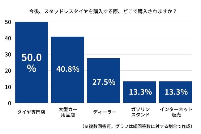 続いて、「購入場所」を聞いたところ、第1位は「タイヤ専門店」(50.0%)で、2人に1人の人がタイヤ専門店にて、購入を検討するようです。
