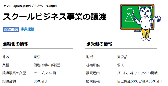 個人の独立・開業の支援事業を展開する株式会社アントレ(本社:東京都港区、代表取締役:上田隆志)の子会社である株式会社アントレプラス(本社:東京都港区、代表取締役:田中翔、以下アントレプラス)は、少額の個人M&A実現を目指す希望者に対し、専門家が必要な知識や情報を伝授し、実際の成約まで伴走型で支援する学習プログラム『アントレ事業承継実践プログラム(https://entrenet.jp/jigyosyokei/index3.htm?vos=nentnetetcpr_00003)』の受講者である東京都在住、早期退職後プログラムに参加された56才男性が、この度、個別指導の学習塾を事業承継したことをお知らせします。