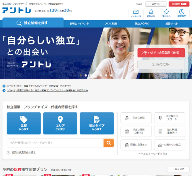 1997年2月より、独立のために必要な情報を集約した日本最大級の独立開業専門サイト。利用者の興味関心のある独立開業プランへの「資料請求&資料ダウンロード、説明会予約」機能を提供。先輩の成功談・失敗談や企業検索から説明会・個別面談会情報まで比較検討できるフォーマットで提供する点が特長。アントレの会員数は35万人を超え、約230件のフランチャイズ・代理店・業務委託募集といった独立開業プランを紹介することで、週2,500〜4,000件の資料請求や説明会予約につながっている。(2023年8月時点)