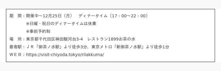 また、千代田区内の2か所の飲食店にて、リラックマたちの「家康風コラボメニュー」も登場します。