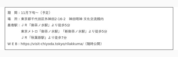 さらに同プロジェクトのうちの1つである謎解きイベントの開催を盛り上げるため、11月13日(月)には謎解きキット販売場所である「東京シティアイパフォーマンスゾーン(千代田区丸の内2-7-2 KITTE地下1階)」にて、観光大使リラックマが特別出演し、撮影会(整理券配布)も行います。
