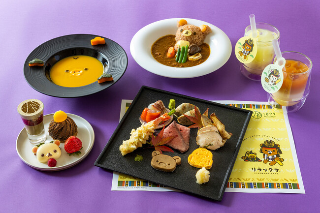 キイロイトリを表現したカボチャのスープや、リラックマがくつろぐ和風のキーマカレーなどの料理3皿と、コリラックマを模したプリンなどのデザートプレート、登場キャラクターをイメージした日本茶ラテを2種類から1種類選べるほか、日本茶と、日本茶を使ったノンアルコールカクテル「モクテル」を飲み放題!リラックマたちが江戸城を普請した「徳川家康公」になりきった姿をデザインしたオリジナルのペーパーランチョンマット付き。