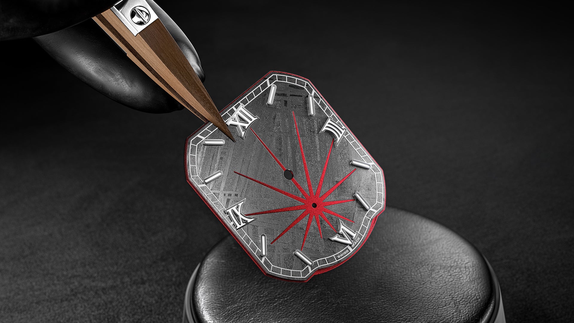 ジェラルド・チャールズのクリエイティブチームが考案したのは、印象的な二層構造。上層には薄くスライスしたメテオライト、その下にはアルミニウム製ベースプレートを配し、ダークブラストモデルには赤、シルバーモデルにはシルバーを採用しています。文字盤には放射状の開口部が穿たれ、下層のエネルギーを帯びたベースプレートが露出することで、衝突の衝撃波を想起させます。6時位置には立体的なスモールセコンドが爆発の瞬間を躍動的に表現し、マエストロ特有のジオメトリーがエネルギーを上方へと導き、力強く立ち上がる流れを生み出します。