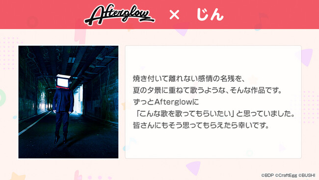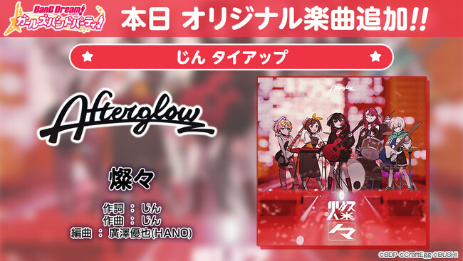 スマートフォンアプリの企画開発事業を展開する株式会社Craft Egg(本社:東京都渋谷区 代表取締役:森川 修一、以下、Craft Egg)と、株式会社ブシロード(本社:東京都中野区 代表取締役社長:木谷 高明、以下、ブシロード)の共同制作によるスマートフォン向けゲーム「バンドリ! ガールズバンドパーティ!」(以下、ガルパ)は、2023年8月31日(木)15時より、アーティストタイアップ「Afterglow×じん」を実施し、じんさんからAfterglowへの提供楽曲『燦々』をゲーム内に追加いたしました。