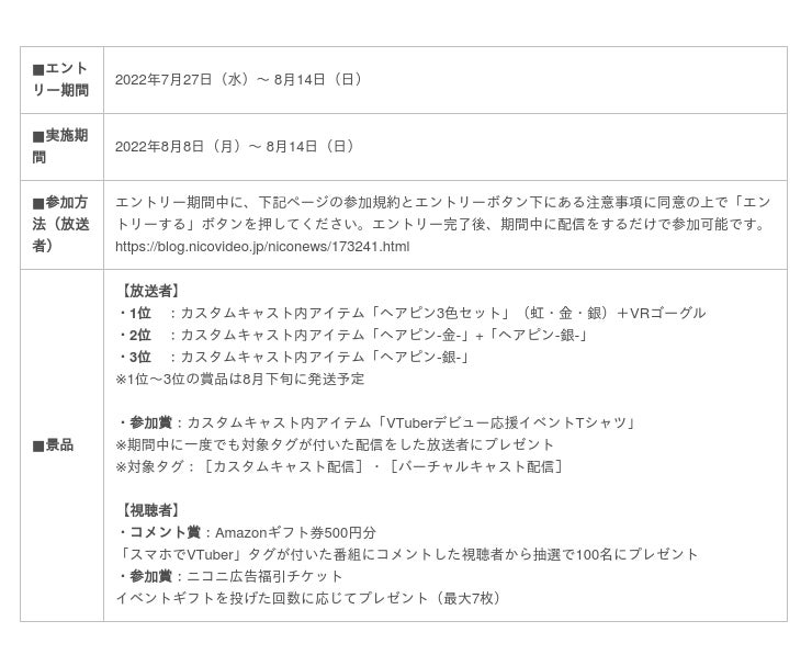 VTuberを応援することを目的としたイベント「スマホひとつでVTuberになろう!」を開催します。本イベントでは、エントリーした放送者の番組に対して贈られた累計ギフトポイント数で順位を決定し、上位放送者にはVRゴーグルやカスタムキャスト内アイテム、番組にコメントした視聴者にはAmazonギフト券500円分(抽選)やニコニ広告福引チケットなどの景品をプレゼントします。