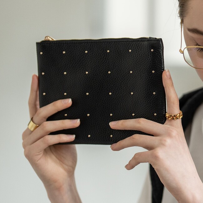 ブラックレザーにキラリと光る、チェーンストラップやドットが印象的なアイテムたち。
