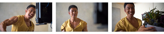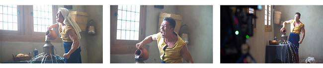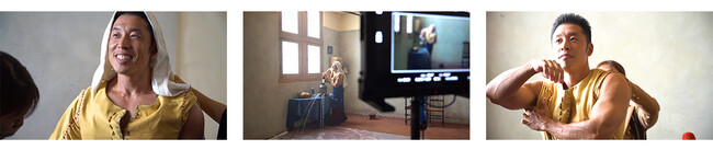 あの名画さながらの衣装に身を包み登場したなかやまきんに君。現場ではスタッフひとりひとりへ、丁寧に挨拶をし、撮影前の監督との打ち合わせでは真剣な眼差しで演出を確認して、リハーサルに臨みます。初めて小道具の水瓶を手にすると、見た目からはわからないその重さから思わず「重っ!」と声が漏れます。リハーサルでは、「やーーーーーーーーーーーーーーーーーーーーっ!」と叫ぶ秒数や表情だけでなく、自慢の上腕二頭筋の力の入り具合なども入念に確認されており、リハーサルの動画をチェックしている際にはご自身の演技と名画とのギャップに思わず笑顔がこぼれるシーンも見受けられました。