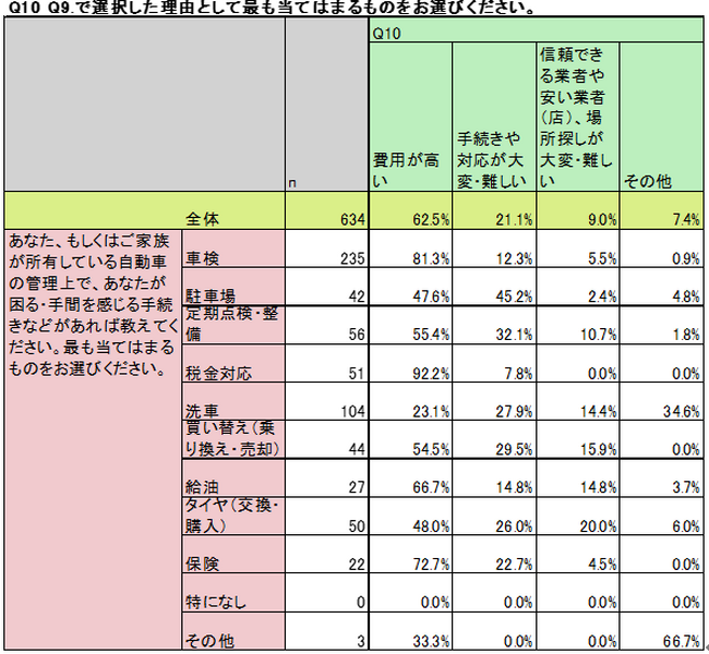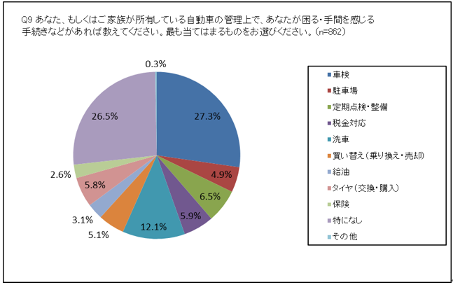 自身もしくは家族が所有している自動車の管理において、困る・手間に関する質問では、全体の27.3%の人が「車検」を挙げる結果となりました。