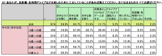 「好きな歌を歌う」という人も21.6%と3番目に多い結果となりましたが、特に若年になるにつれその割合は高くなりました。眠気を覚ますためにも歌い、楽しむためにも歌う、そんな若年層が増えているようです。流行りの歌を歌うのか、往年のドライブソングを歌うのか、さまざまな楽しみ方があると思いますが、皆さまはいかがでしょうか。