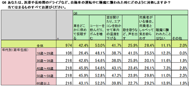 渋滞や長時間のドライブなど、自動車の運転中に睡魔に襲われた時にどのように対処するか伺ったところ、よく睡魔対策として挙げられるコーヒーを飲む・ガムを噛むなどの行動を取る人が全体の53.0%と半数以上の人が実践しているようです。「車をどこかに停めて仮眠する」という対処も42.4%と多い回答となりました。