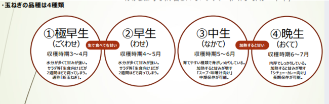 玉ねぎにも品種があり、3月下旬から5月初旬頃にかけて出荷される品種で、いわゆる 「新玉ねぎ」 と呼ばれる種類です。 「早生」(わせ)と呼ばれるの玉ねぎは特に甘みが強く、みずみずしく、やわらかいので、生で食べるのも美味です。