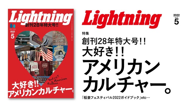 株式会社ヘリテージ(本社:東京都新宿区、代表取締役:齋藤 健一、以下 ヘリテージ)が発行する雑誌『Lightning(ライトニング)』2022年5月号「大好き!!アメリカンカルチャー。」特集号が、2022年3月30日(水)に発売されます。今回は、創刊28年の特大号!400ページ超えのボリュームでお届けいたします。創刊からテーマとしてきた「アメリカンカルチャー」を軸に、衣食住やライフスタイルの決め手になるカテゴリーを深掘りし、アメリカ文化を凝縮した1冊となっております。また、5月1日(日)開催の「稲妻フェスティバル2022」公式ガイドブックを掲載!ぜひ、お見逃しなく。