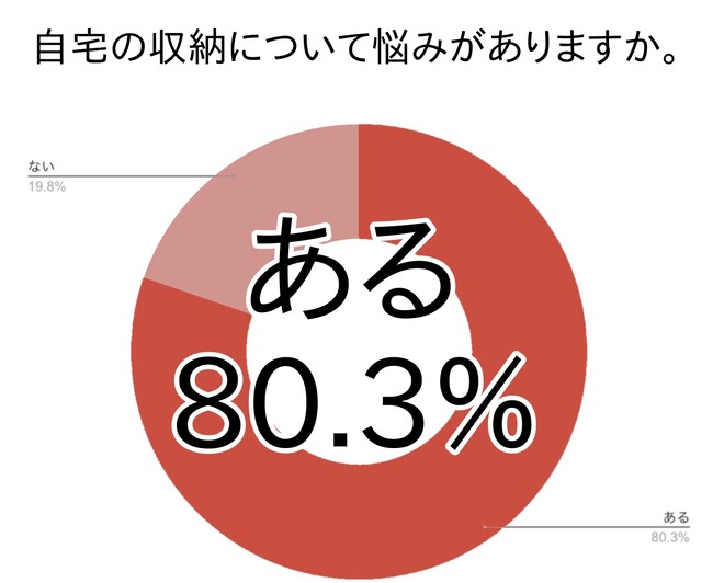 全国における回答では自宅の収納について悩みがある方は8割超(80.3%)でした。大多数の方が収納について何らかの悩みをもって生活しているようです。