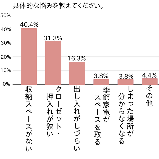 メイン収納のクローゼット・押入れを始めさまざまな部屋の収納に悩みがある方が多いことが分かりましたが、具体的な収納の悩みについてアンケートで尋ねてみました。