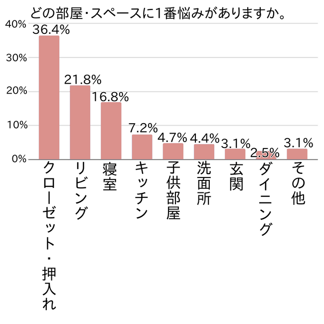 次に多かったのが、これも収納スペースの不足に関する悩みですが、「クローゼット・押入れが狭い(31.3%)」でした。約3人に1人がメイン収納であるクローゼット・押入れの広さに満足できていないことになります。