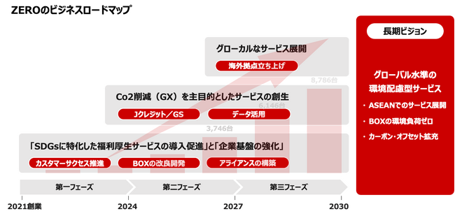 ZEROは、「地球上の貧困をゼロにする」をビジョンに掲げ、フードロスの削減を図る無人販売機fuuboを開発しました。フードロスやCO2排出量削減への取り組み、福利厚生の充実を図る企業と契約のうえ、オフィスなどにfuuboを設置、そこに食品メーカーや食品卸企業から、賞味期限が近く、通常の販売ルートでは流通できない食品、パッケージの変更などを理由に廃棄される可能性のある食品を安価に仕入れて提供、導入先からサービス料を回収するビジネスモデルです。導入した企業においては、fuuboの活用によって生まれるCO2排出量削減効果を可視化することで、貢献度の訴求を可能とします。現在、全国の駅、商業施設、オフィスなど、多くの場所に設置されており、一般消費者や導入企業の従業員などに利用いただいています。