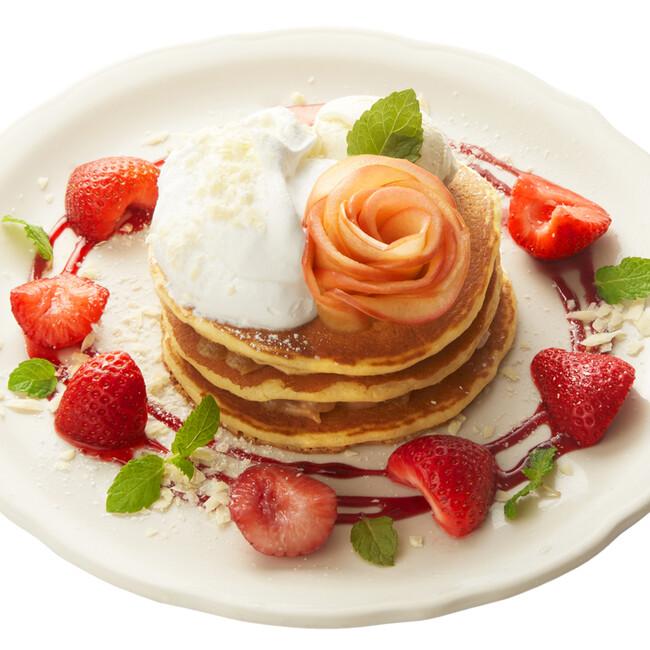 りんごのバラの花が可愛らしい「白雪姫」をイメージしたバターミルクパンケーキ。パンケーキの間には、キャラメルフレイバーの特製アップルフィリングをたっぷりサンドしました。