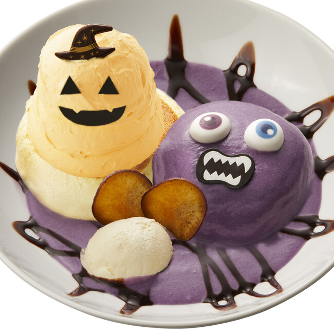 沖縄県産の紅いもクリームのモンスターと、パンプキンクリームをトッピングした、かわいらしいおばけのふわふわパンケーキ。ハロウィンシーズンにぴったりのひと品です。