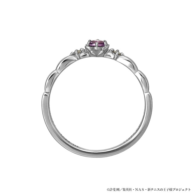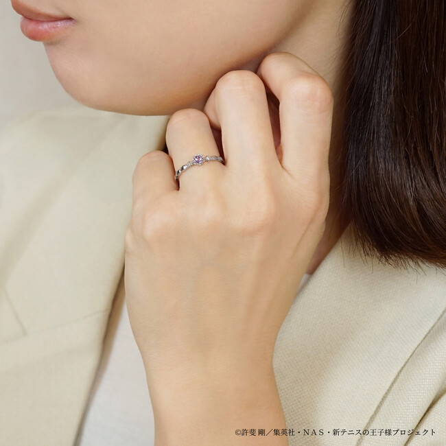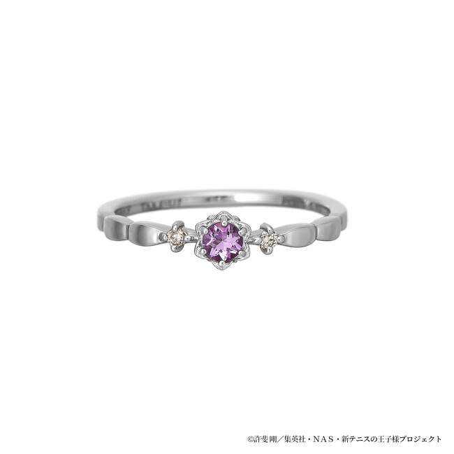 常に笑顔を絶やさず物腰も柔らかいが、心の奥底は誰にも見せない不二。そんなミステリアスな雰囲気をイメージし、センターには神秘的な紫色の輝きを放つアメジストをセッティング。2月のバースデーストーンがリングを彩ります。テイクアップらしいカラーストーン使いとMade in Japanのクオリティーで仕上げた、不二周助の特別な誕生日を記念するリングです。リングは豪華BOXに包み、今回のコラボレーションの為特別に描き下ろしたアートを使用したアクリルリングスタンドとご一緒にお届けいたします。