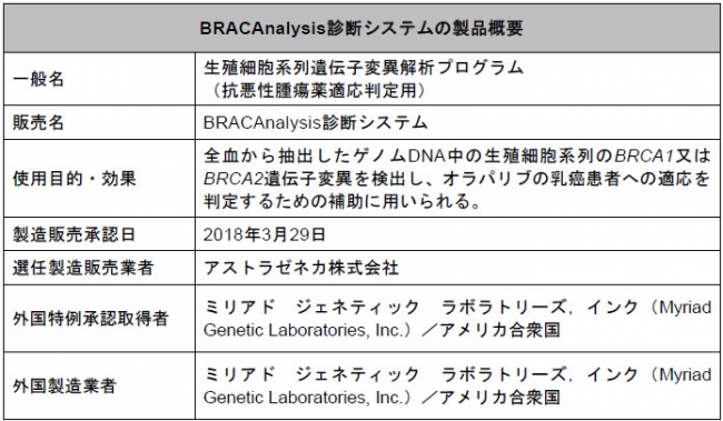 アストラゼネカ英国本社は、2007年にミリアド社とリムパーザのコンパニオン診断システムの開発に関する業務提携を締結しており、2014年には米国でBRACAnalysis CDxが承認されています。