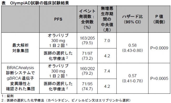OlympiAD試験全体として、無作為割付けした302例のうち299例についてBRACAnalysis診断システムによるプロスペクティブな検査又は再検査を実施。OlympiAD試験の最大解析対象集団の98%に相当する297例において生殖細胞系列 BRCA(gBRCA)遺伝子変異に関し、病的変異又は病的変異疑いであることが確認されました。BRACAnalysis診断システムによるgBRCA遺伝子変異陽性集団の結果は、OlympiAD試験の全体集団302例の結果と同様であり、本検査の有用性が裏付けられています。