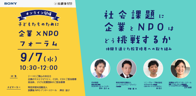 本評価結果の報告を兼ね備えたオンラインイベント「社会課題に企業とNPOはどう挑戦するか〜体験を通じた教育格差への取り組み〜」を、「感動体験プログラム」のパートナー団体である、特定非営利活動法人団体である放課後NPOアフタースクール(以下、放課後NPOアフタースクール)と共同で9月7日(水)に開催します。本イベントでは、より多くの企業やNPO、自治体など、多様なステークホルダーが次世代育成に取り組むことの重要性を広く発信するために開催するものです。