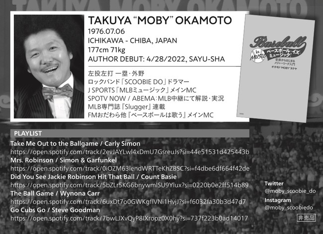 MLB解説者にしてロックバンドSCOOBIE DOのオカモト“MOBY”タクヤが、メジャーリーグミュージックを徹底ガイドした『ベースボール・イズ・ミュージック! 音楽からはじまるメジャーリーグ入門』が本日4月28日より順次全国書店で発売になります。大谷翔平ほかメジャーリーガーの入場曲、歌詞になったメジャーリーガーや野球好きのミュージシャンの逸話まで、豊富な注釈つきで幅広く解説。シーズン開幕でメジャーリーグが盛り上がる今にぴったりな一冊です。