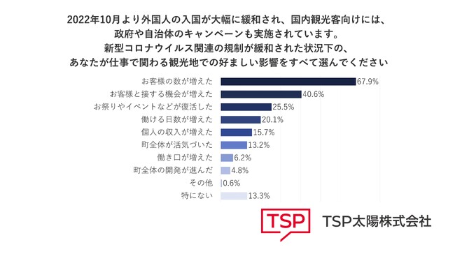 “「特定の場所に特定の目的を持ってある一定期間, 人々が集積することで特徴づけられるイベントで, その国やコミュニティの計画や対応リソースに負担をかける可能性があるもの」”を“マスギャザリング”と定義されています。 引用元:マスギャザリングイベント(東京2020大会)と感染症対策|国立感染症研究所 “マスギャザリング”では、人が集まることが分かっているイベントでは参加者の安全確保はもちろんのこと、開催地域に負担を与えないことも重要になります。開催場所の医療・公衆衛生への影響も考えながら計画的に準備し、十分なリソースを確保することが求められます。 ■新型コロナウイルス関連の規制が緩和後の観光業への影響 「2022年10月以降、新型コロナウイルス関連の規制が緩和された状況下で観光地での好ましい影響をすべて選んでください」という問いに対し、「お客様の数が増えた」という回答が67.9%、「お客様と接する機会が増えた」40.6%、つづいて「お祭りやイベントなどが復活した」25.5%と、観光客数の増加を感じているという声が多く、また観光地の活気を取り戻しつつあることがわかります。