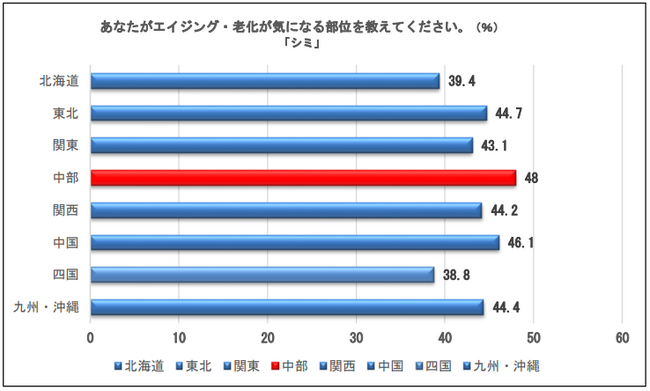 「あなたがエイジング・老化が気になる部位を教えてください。」の設問に対し、上位だった「シミ」の回答をエリア別にみると中部エリアで48%と約半数が気になると回答した。