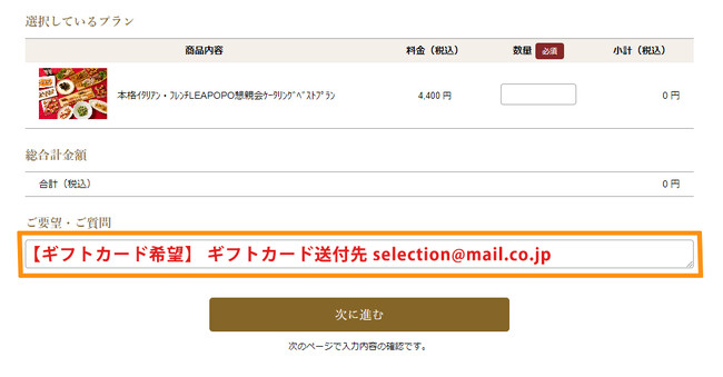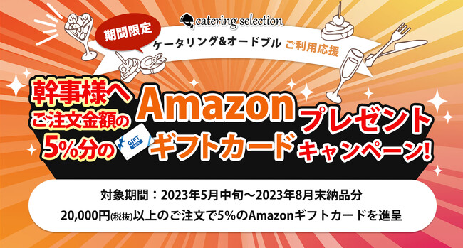 ■概要:ご注文金額の5%のAmazonギフトカードを幹事様へプレゼント!■対象期間:2023年5月中旬〜2023年8月末納品■ギフトカードの進呈期間:納品の翌月末までにメールにて送付■詳細:20,000円(税抜)以上のご注文で5%のAmazonギフトカードを進呈いたします!※ご注文金額10,000円ごとに500円単位で進呈(例)20,000円×5%=1,000円→1,000円ギフトカードの進呈 24,000円×5%=1,200円→1,000円ギフトカードの進呈 30,000円×5%=1,500円→1,500円ギフトカードの進呈 1,000,000円×5%=50,000円→50,000円ギフトカードの進呈※本キャンペーン特典は『Amazonギフトカード』のプレゼントのみとさせていただきます。Amazonギフトカード以外の進呈やその他割引への代替えなどは実施しておりませんのでご了承ください。■お申し込み方法:※HPからの場合:お料理ご注文時の「ご要望・ご質問欄」に【ギフトカード希望】とご記載ください。※お電話からの場合:「ギフトカード希望」の旨をお伝えください。※HPから、お電話いずれの場合でも、ギフトカード送付用メールアドレスを明示してください。▼弊社HPお申込み画面イメージです。