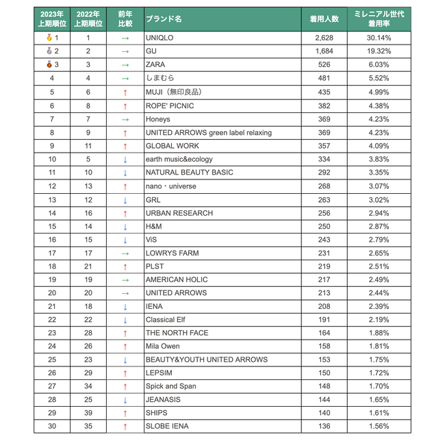 2023年上半期(1月〜6月)にカレンダーに登録されたコーディネートのデータから、ミレニアル世代の女性がどのファッションブランドのアイテムを実際に着用したのか調査を実施しました。