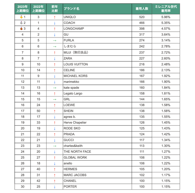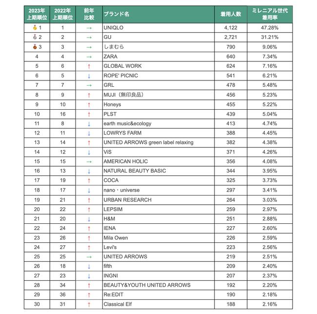 2023年上半期にミレニアル世代が着用したファッションブランドのランキング