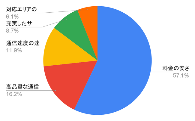 「携帯会社に一番求めるものは、次のうちどれですか?」の問いでは、「料金の安さ」が全体の57%と多かったため、満足度の高い携帯会社ランキングの要因としては、料金面が重要だと考えられました。
