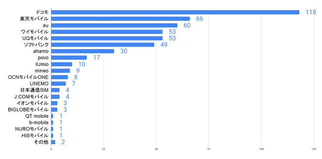 現在契約しているキャリアについては、ドコモが118人と最も多く、次に楽天モバイル・au・ワイモバイルが多い結果となりました。
