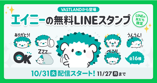 VASTLAND株式会社(本社:兵庫県姫路市/代表:田中悠貴)が運営するキャンプギアブランド「VASTLAND(ヴァストランド)」は、公式マスコットキャラクター「ハリネズミのエイニー」の無料LINEスタンプを期間限定で配布いたします。