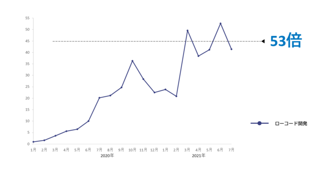 2020年1月の月間PV数を1.0とした場合の、「ローコード開発」カテゴリー月間PV数比率