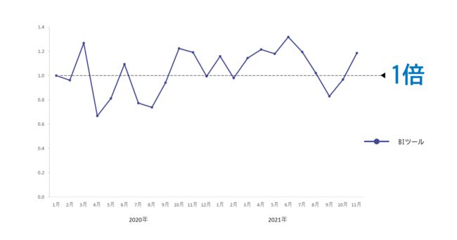 2020年1月の月間PV数を1.0とした場合の、「BIツール」カテゴリー月間PV数比率