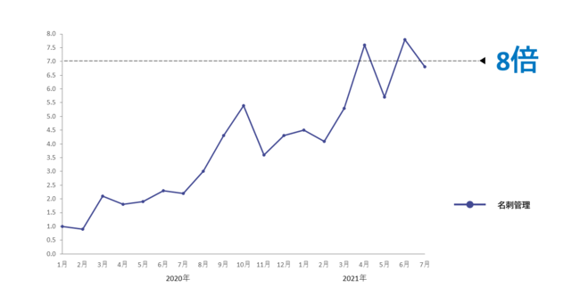2020年1月の月間PV数を1.0とした場合の、「名刺管理」カテゴリー月間PV数比率
