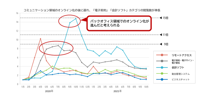 一歩遅れて「電子契約」や「会計」といったバックオフィス領域のオンライン化が続く
