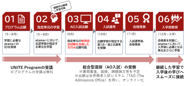 総合型選抜(AO選抜入学試験)の出願要件として導入する、AI学習システム「atama+」で、各学部が指定する教科の単元を学習・修得するプログラム。期間中は繰り返し学習可能。プログラム出願無料。